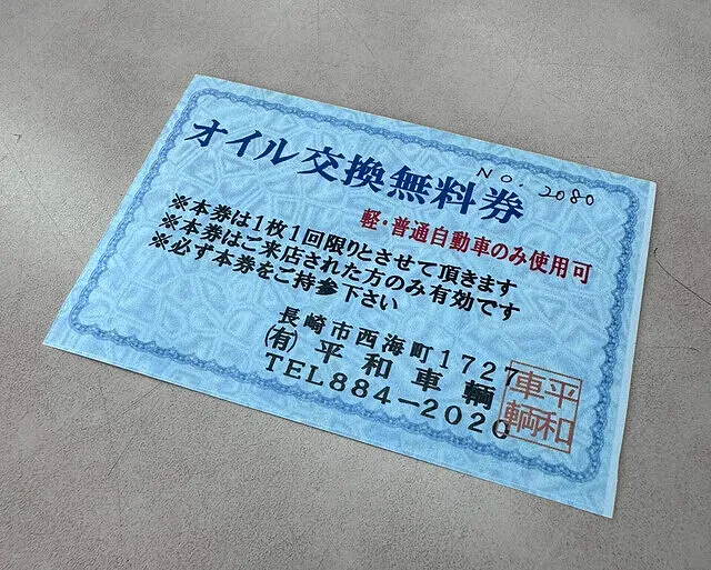 次回よりご利用いただけるエンジンオイル交換無料券を進呈いたします。