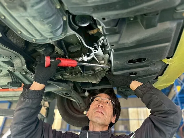 日頃見ることができない箇所まで点検・整備を行い、その後、民間車検場の認可を受けた関連会社で検査を行います。二重のチェック体制でお客様のお車の安全を守ります。